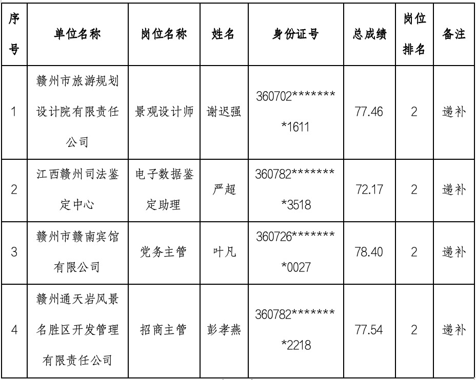 根據(jù)《“國(guó)資贛將”贛州旅游投資集團(tuán)2024年第一批社會(huì)公開(kāi)招聘公告》規(guī)定,經(jīng)研究,按程序遞補(bǔ)聘用4人,具體名單如下: